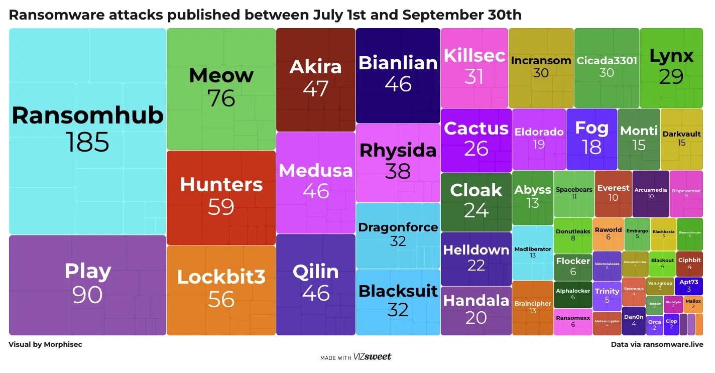 Powered by Automated Moving Target Defense, Morphisec’s Anti-Ransomware Assurance Suite offers capabilities that prevent ransomware attacks at multiple stages. The following graphic shows prominent ransomware attacks globally from the period of July through September 2024. AMTD mechanisms implemented by Morphisec have effectively prevented in-production ransomware attacks from well-known groups like Ransomhub (BlackCat), Cicada, Lockbit etc., thus validating anti-ransomware assurance capabilities.