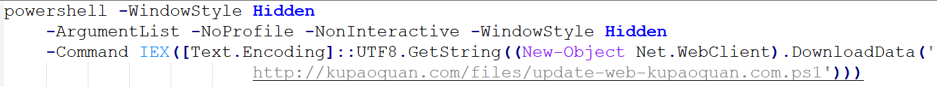 This spawns a hidden PowerShell process that downloads and executes a secondary script from hxxp://kupaoquan[.]com/files/update-web-kupaoquan.com.ps1.