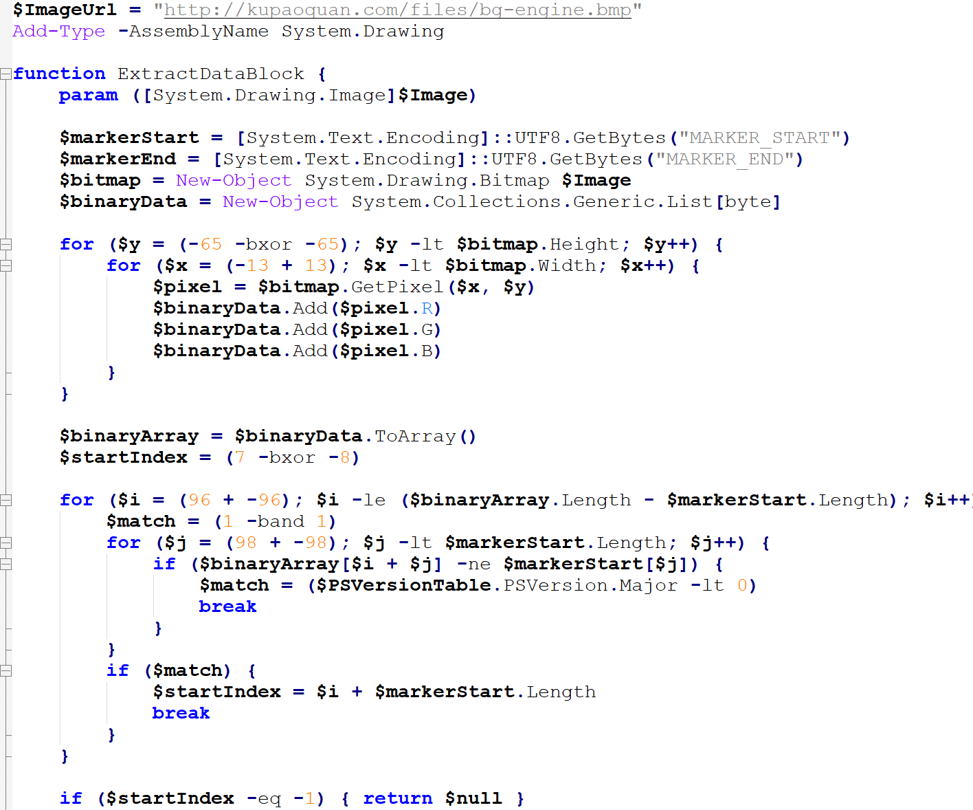 The downloaded script (update-web-kupaoquan.com.ps1) employs steganography to hide the next-stage payload inside an innocuous BMP image (bg-engine.bmp).