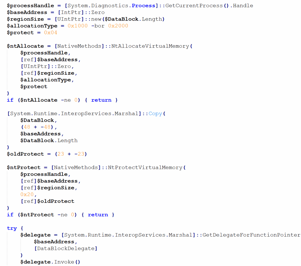 A key evasion tactic lies in the execution: Rather than direct P/Invoke calls to native APIs, the script compiles inline C# and uses Marshal.GetDelegateForFunctionPointer to invoke functions dynamically.